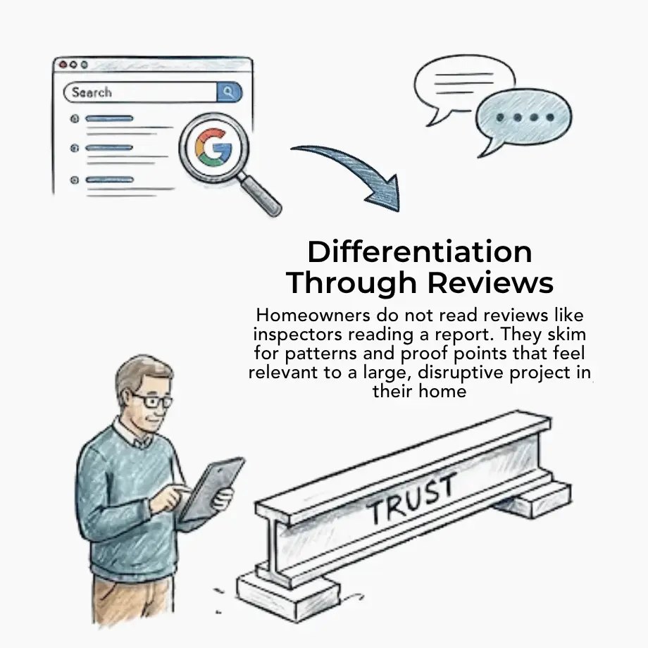 Homeowners do not read reviews like inspectors reading a report. They skim for patterns and proof points that feel relevant to a large, disruptive project in their home: