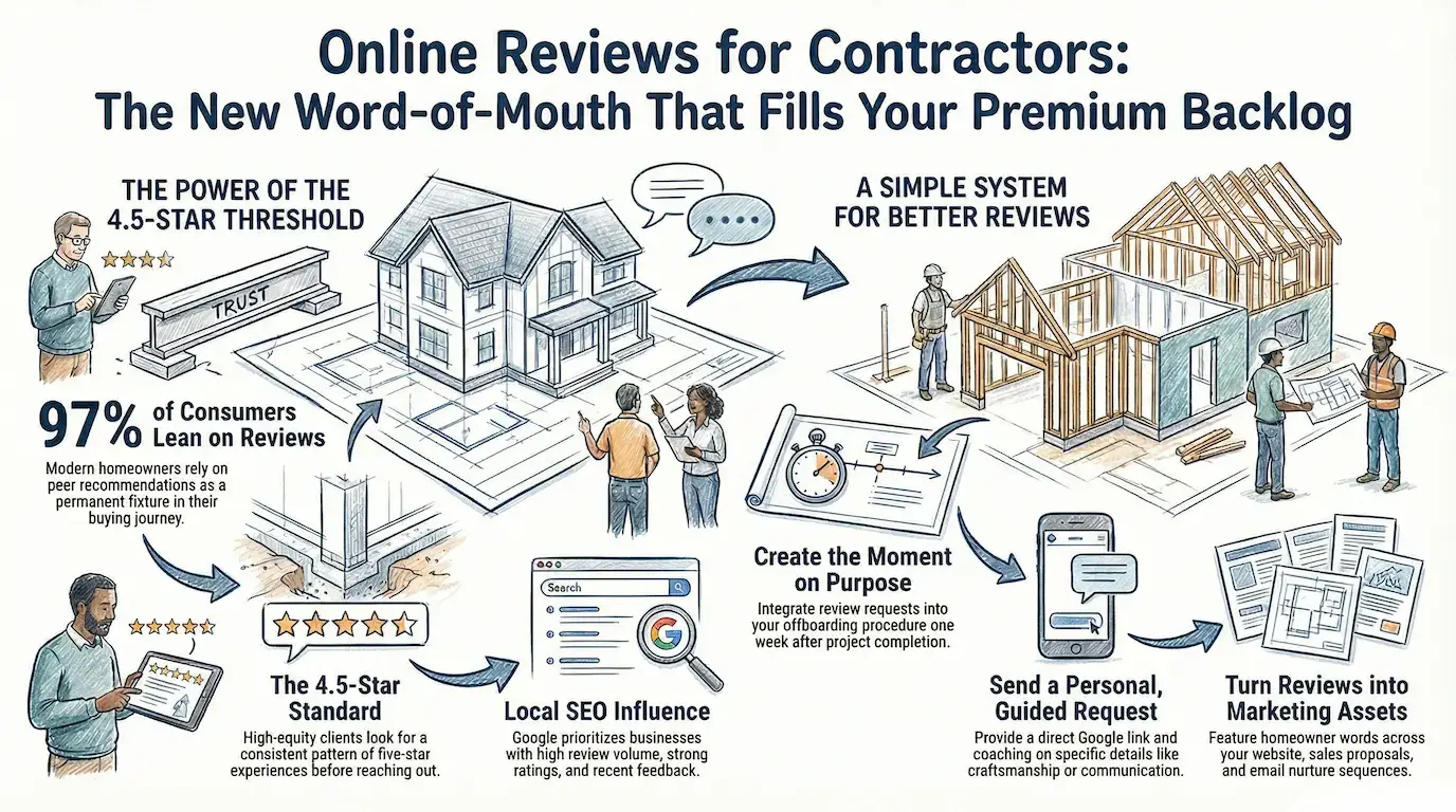 - Premium remodelers can no longer rely on referrals alone; a steady, visible stream of detailed reviews directly improves backlog quality, pricing power, and differentiation.