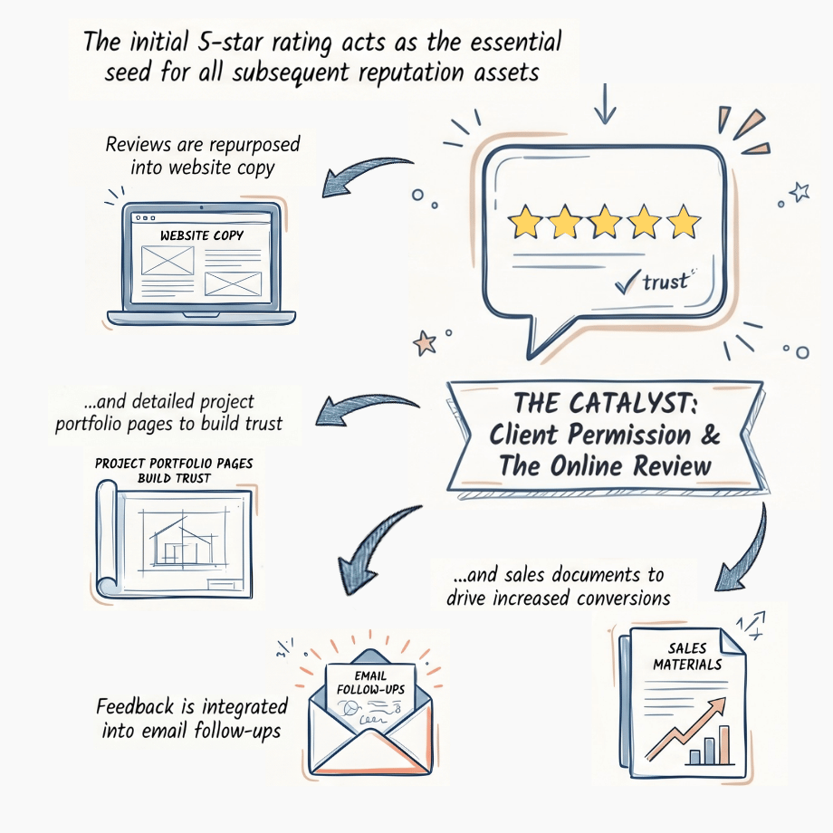 Your work builds high‑quality, transformational projects → Your exceptional process builds trust → Your reviews broadcast this to the clients you ideally want to work with next.