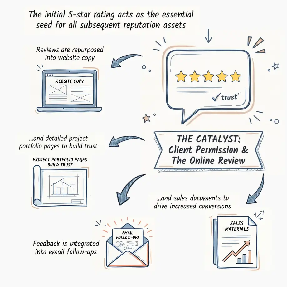 - With the client’s permission, feature their words on your website and in your marketing materials. That review becomes part of your broader reputation system: web copy, project pages, email follow‑ups, and sales materials.